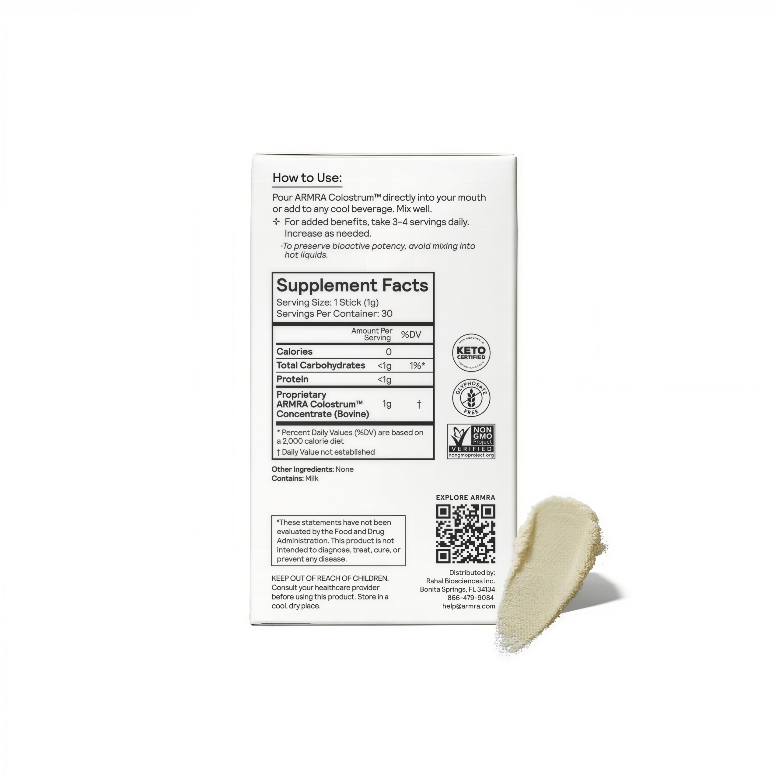 ARMRA Colostrum® confers the same benefits collagen claims, and research suggests it may do so more effectively. Collagen is simply a raw ingredient - and does not get absorbed into the body as collagen, but rather, it is broken down into its individual amino acids just like any other protein with no direct biological activity. However, ARMRA® is very different. It's a proprietary concentrate of over 400+ functional, bioactive nutrients from grass-fed colostrum - a whole food. And contains a host of vitamins, minerals, antioxidants, growth factors, peptides, antibodies, essential amino acids, and compounds that work synergistically in the body to naturally activate and revive cellular processes for a host of research-backed, foundational health benefits for immune health, sleep, metabolism, gut health, hair and skin, and lean muscle building and tissue recovery, among others. These functional nutrients can not be found in collagen or from other sources.